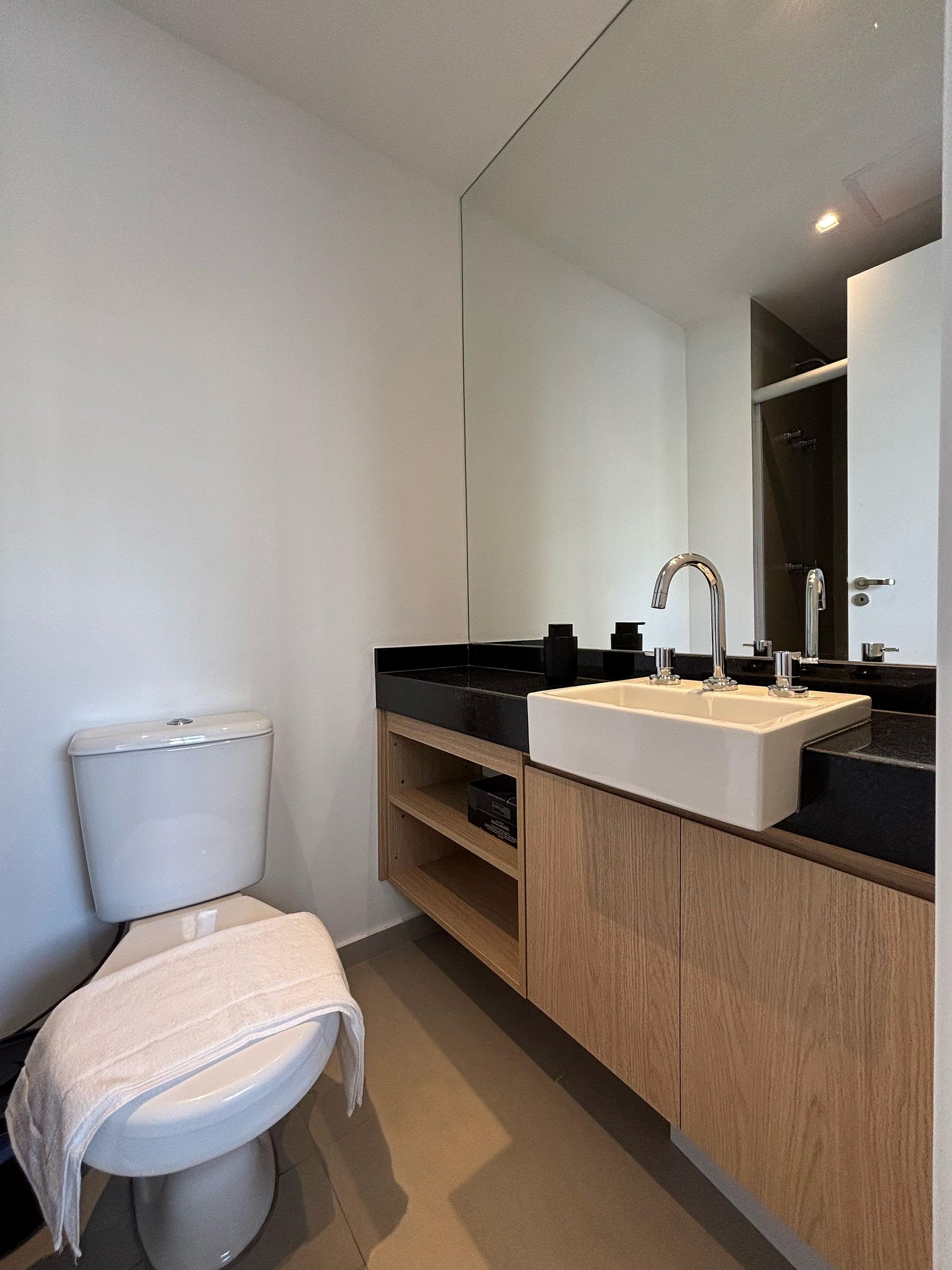 Para sua organização, há armários espaçosos para roupas e uma bancada prática no banheiro, oferecendo bastante espaço para acomodar seus itens de viagem.