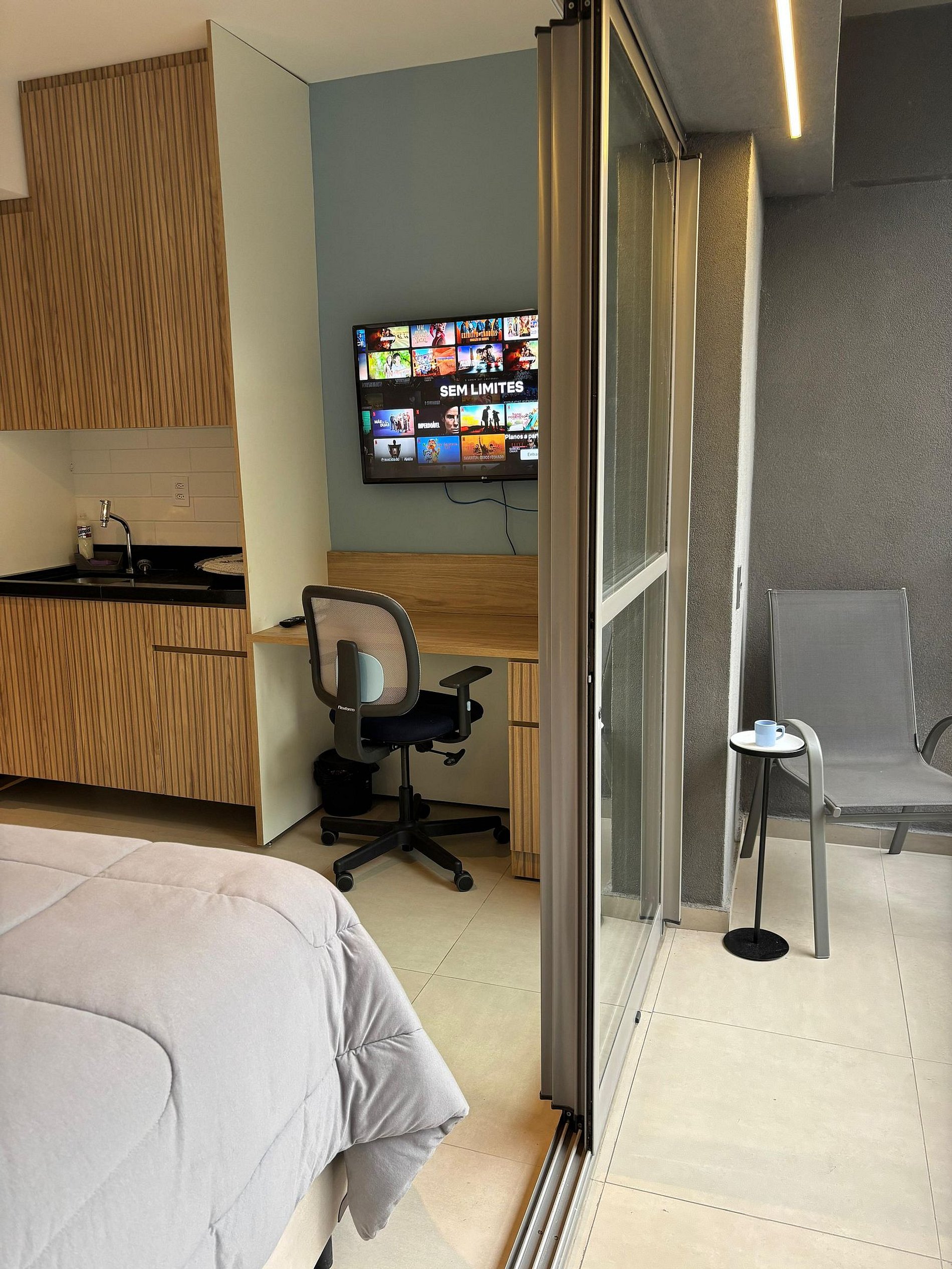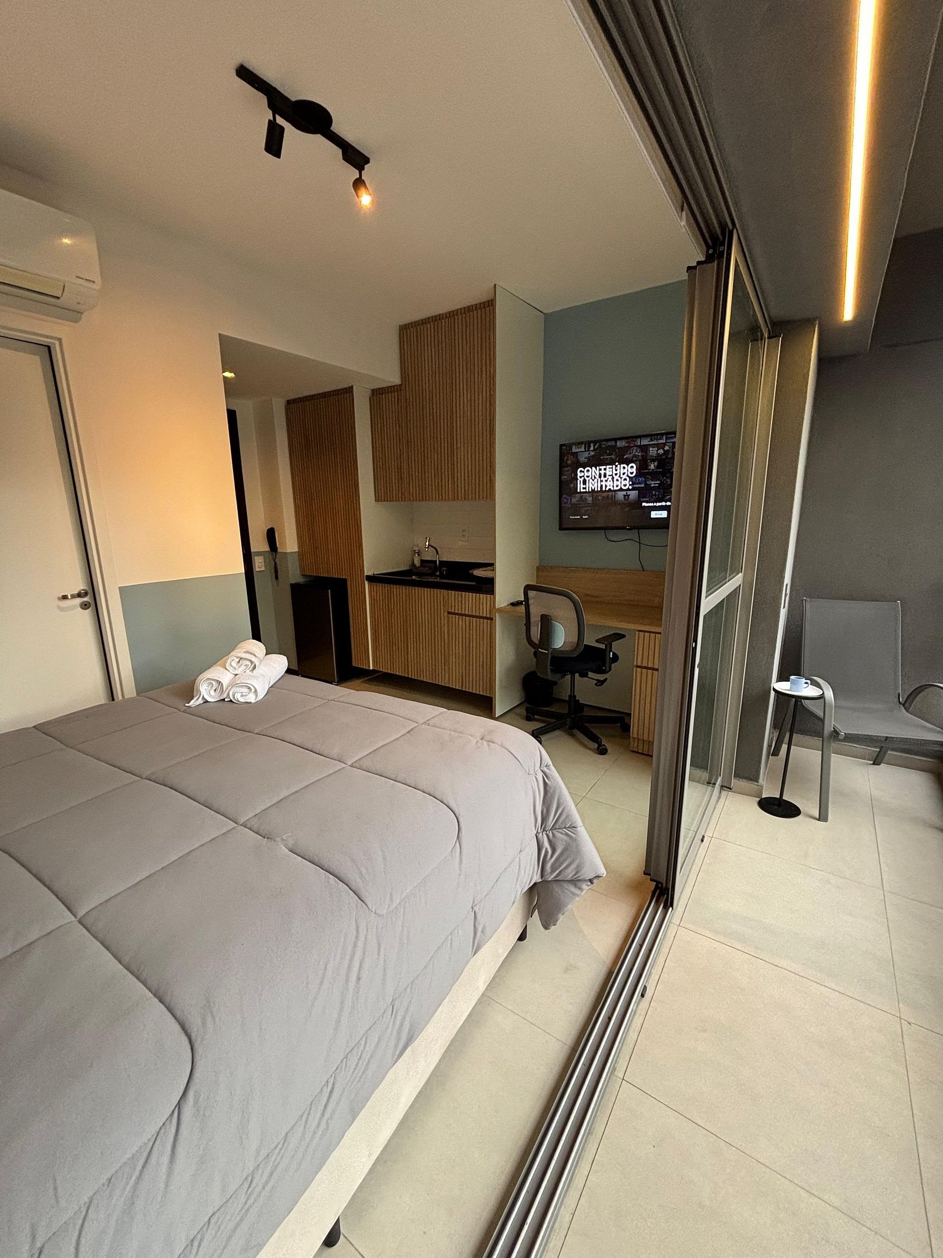 Para momentos de lazer, aproveite a TV com diversos canais e relaxe na varanda privativa, um ótimo espaço para começar o dia com um café ou terminar a noite apreciando a vista.