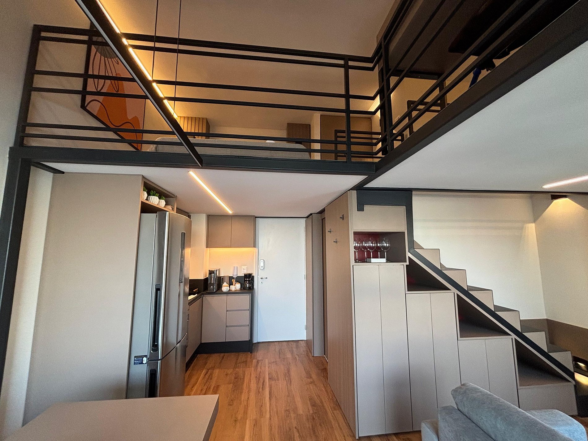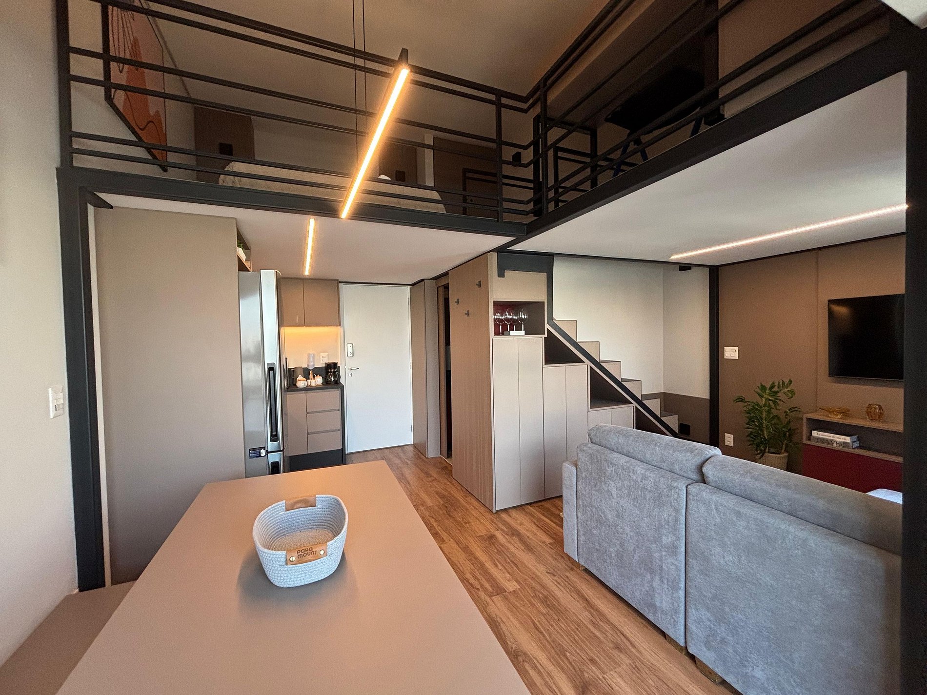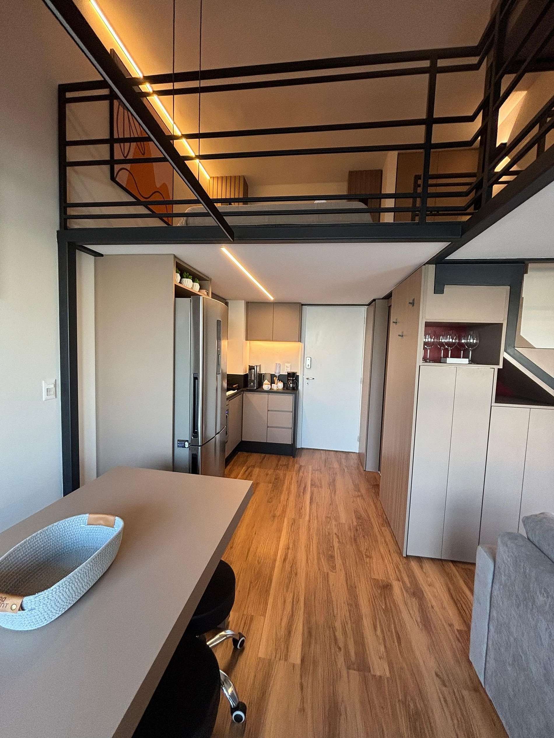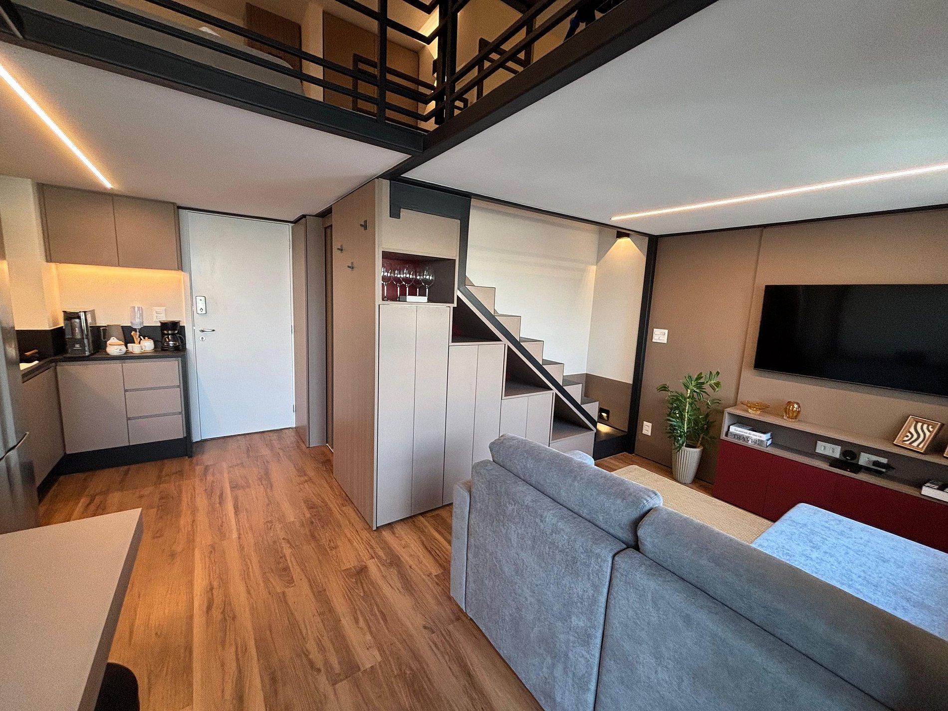 No andar superior, você encontra uma confortável cama de casal, um sofá-cama e uma escrivaninha perfeita para home office, com iluminação natural. No piso inferior, ficam a sala de TV com sofá espaçoso, a cozinha completa, o banheiro e a sala de jantar. A escada é segura e de fácil acesso, integrando bem os ambientes.