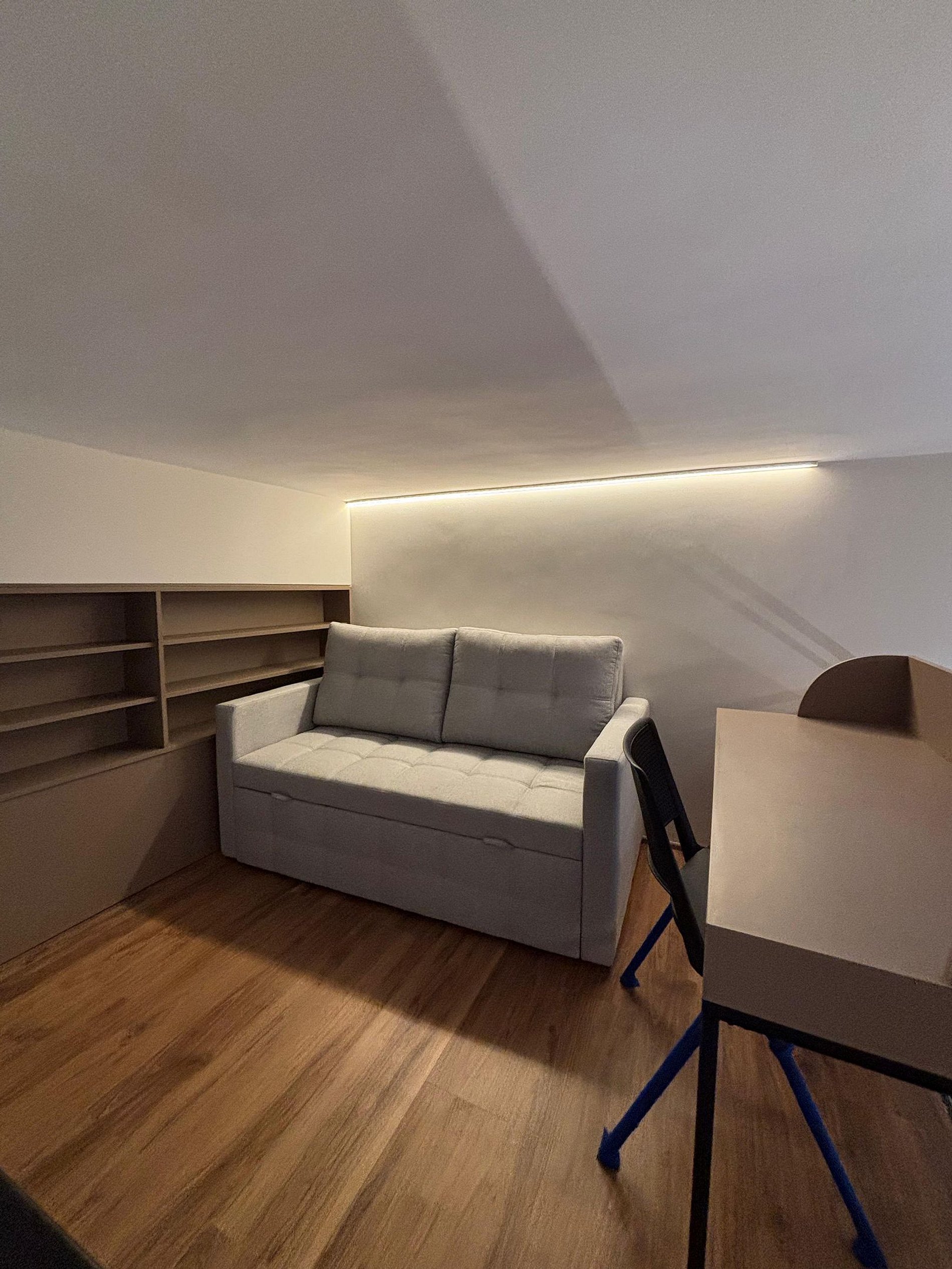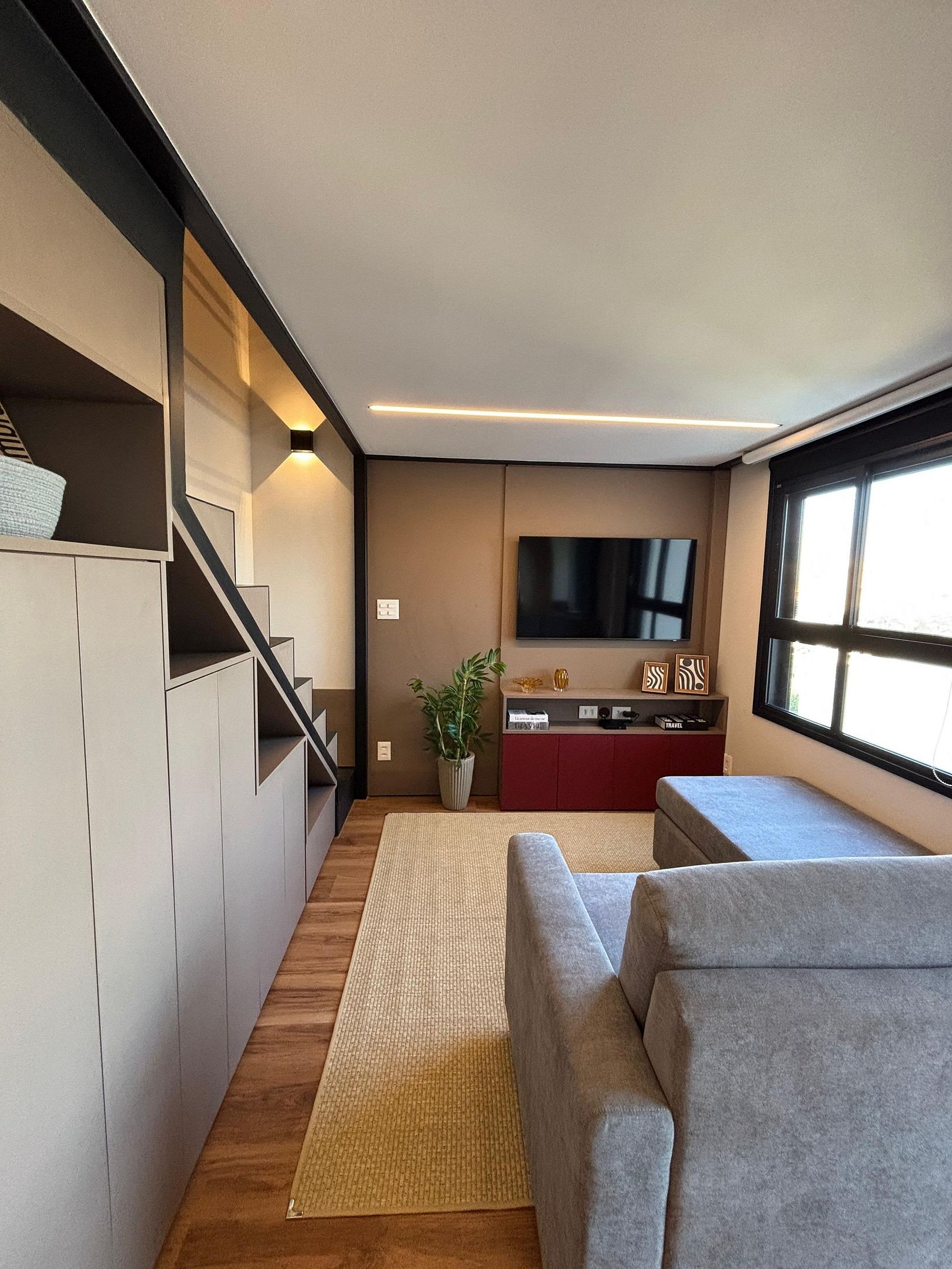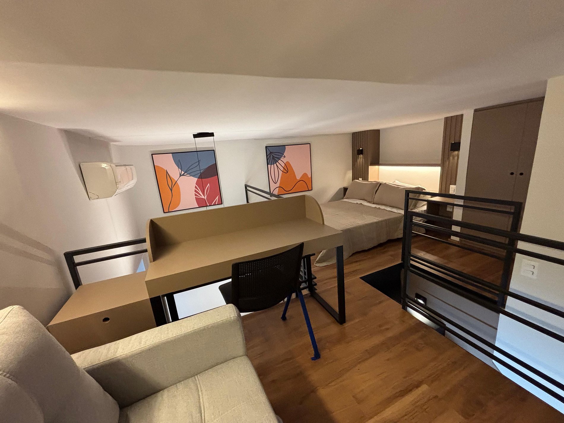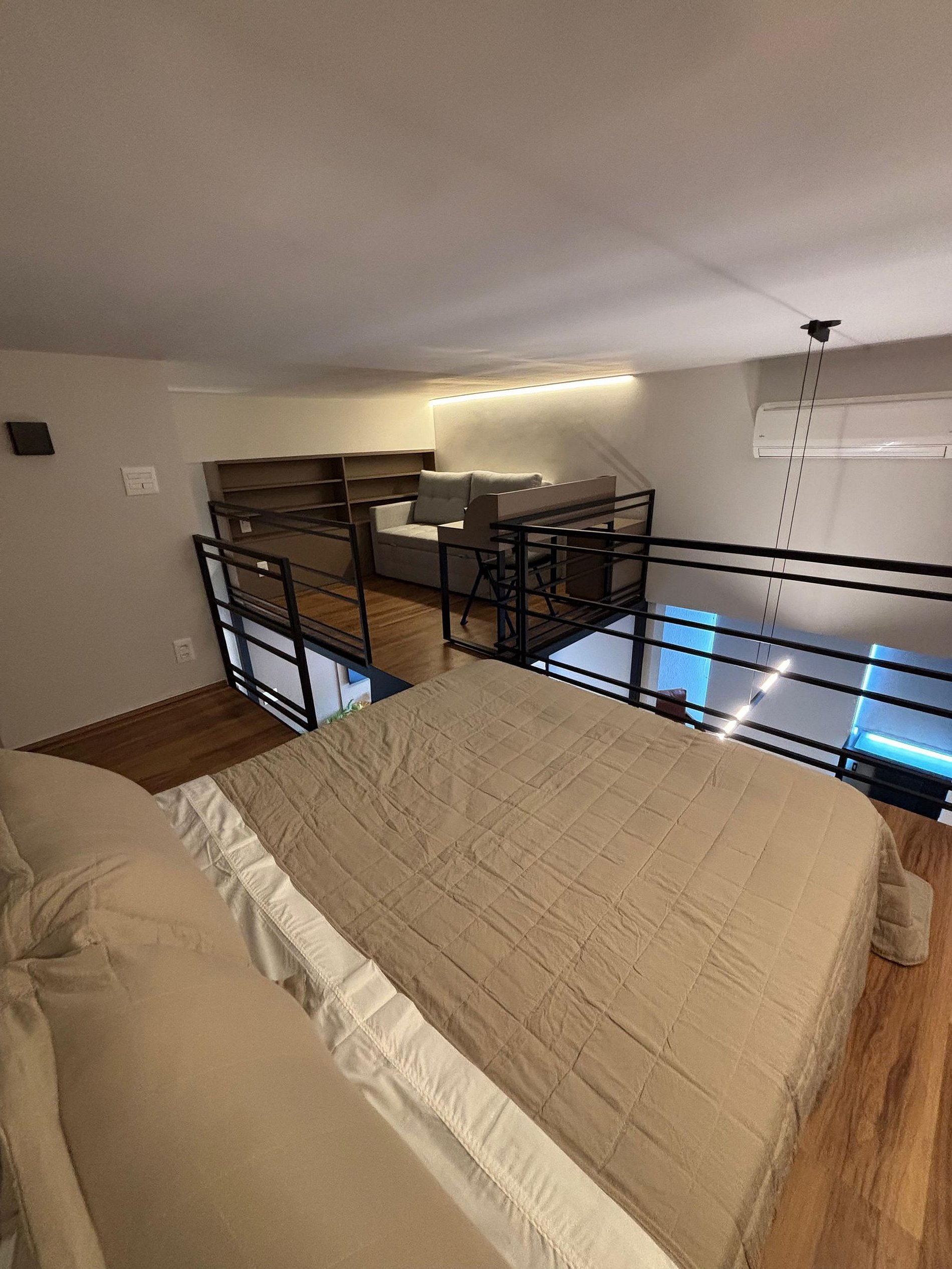 No andar superior, você encontra uma confortável cama de casal, um sofá-cama e uma escrivaninha perfeita para home office, com iluminação natural. No piso inferior, ficam a sala de TV com sofá espaçoso, a cozinha completa, o banheiro e a sala de jantar. A escada é segura e de fácil acesso, integrando bem os ambientes.