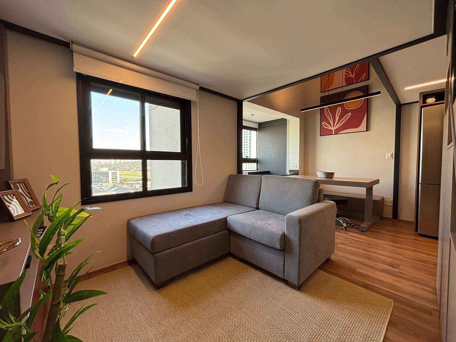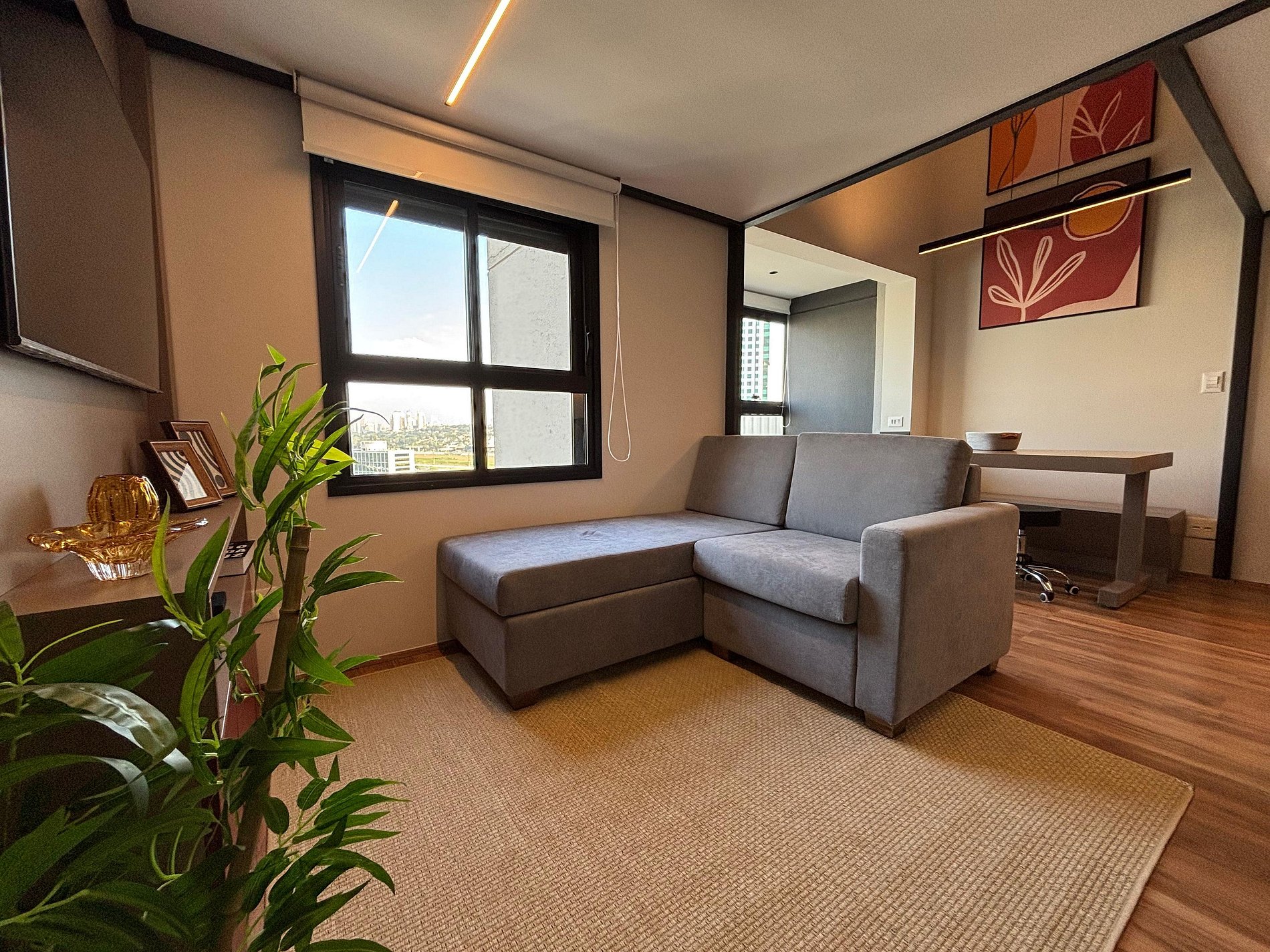 O apartamento foi decorado com muito carinho e atenção aos detalhes, trazendo a sensação de estar em casa. Todos os itens são de alta qualidade, incluindo cafeteira Nespresso, armários espaçosos, mesa de jantar para quatro pessoas e uma varanda com poltrona para relaxar admirando a vista da cidade.